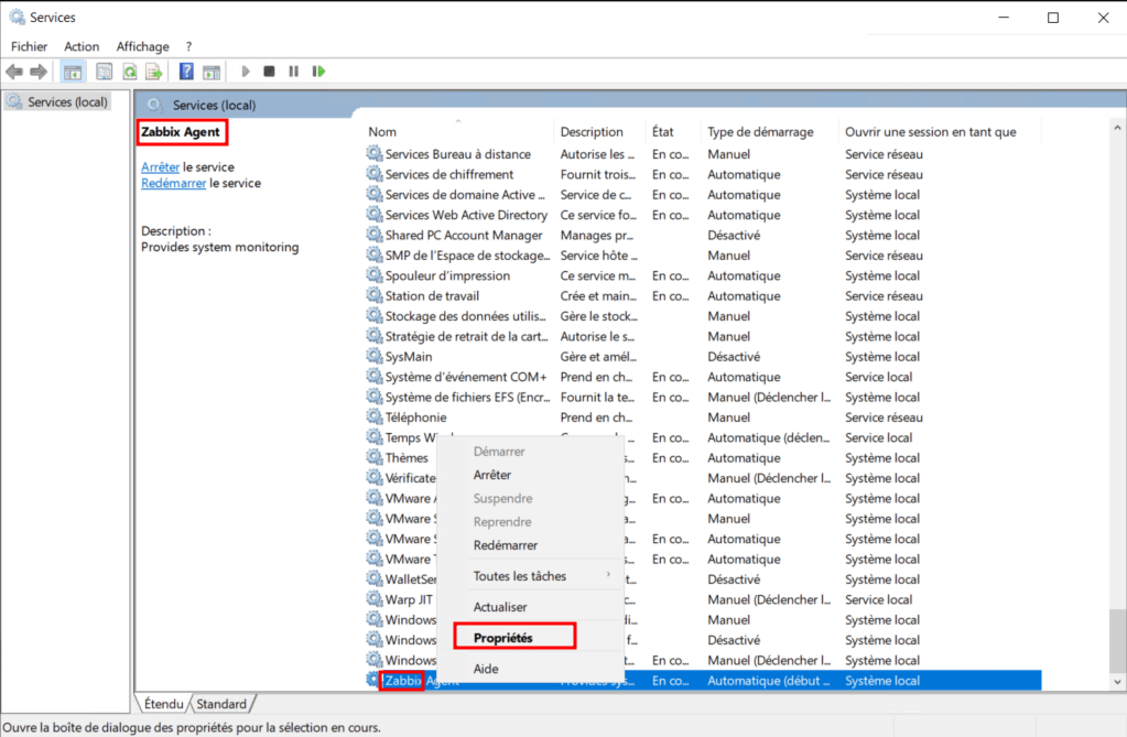 Pour gérer le service de l’agent Zabbix, vous pouvez le démarrer, l’arrêter ou le redémarrer via le panneau de configuration des services Windows. Vous pouvez notamment aller dans les propriétés du service pour gérer plus profondément les paramètres de ce service, arrêtez-le et redémarrez-le au moins une fois pour que les modifications réalisées précédemment dans le fichier de configuration prennent effet :