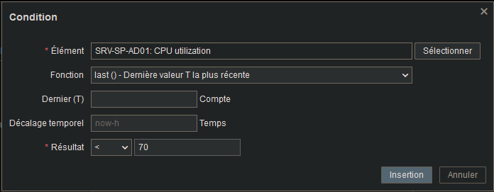 Dans la partie « Expression que vous voyez ci-dessus, vous pourrez cliquer sur le bouton « Ajouter » placé à droite, ce qui vous redirigera vers la petite fenêtre ci-dessous, à partir d’ici vous pourrez sélectionner l’élément, c’est à dire l’hôte qui fera l’objet d’une vérification par le déclencheur et un profil de déclencheur spécifique selon vos besoin, pour notre part, il nous faudra mesurer l’utilisation CPU, donc il nous faut un profil d’utilisation CPU à associer à notre hôte cible, cela nous génèrera une expression et après nous utiliseront les manipulateurs <|> ou = et une valeur, pour notre part, nous voulons une valeur ne dépassant pas 70 donc <70.