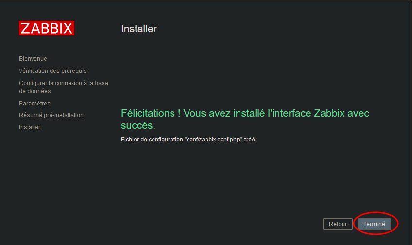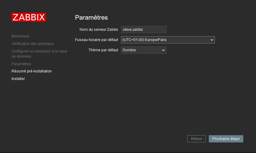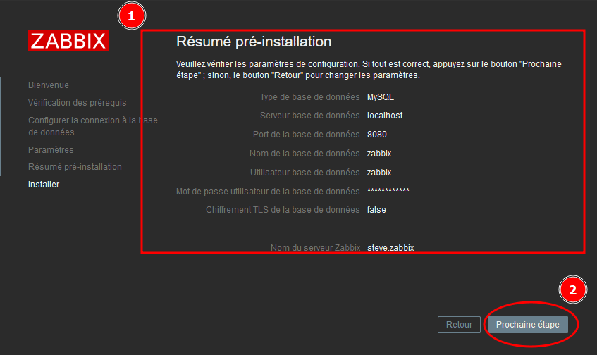 Puis dernière page, vous aurez un résumé des paramètres que vous avez renseingé à l’outil de configuration Zabbix, vérifiez que tout soit cerret et faites prochaine étape :