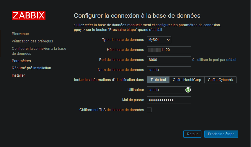 - Mot de passe: Le mot de passe que vous avez préalablement défini à votre utilisateur zabbix pour MySQL.