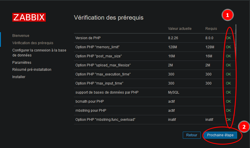Dans la prochaine étape, l’outil de configuration zabbix vérifiera que vous possédez tout les prérequis, normalement tout devrait être vert : OK