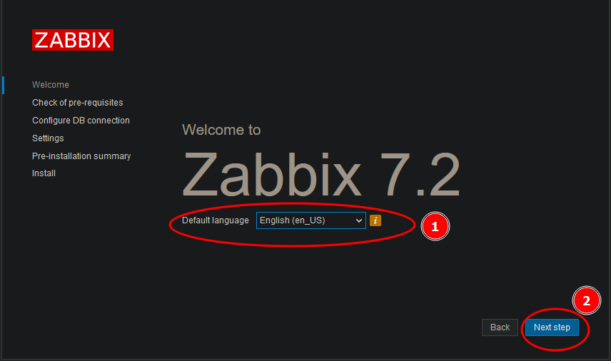 Allez dans la barre URL de votre navigateur et tapez http://IPdevotreserveurzabbix:leportedecoute. La toute première fois, vous devriez arriver sur une page de configuration où l’on vous demanderz de choisir la langue :