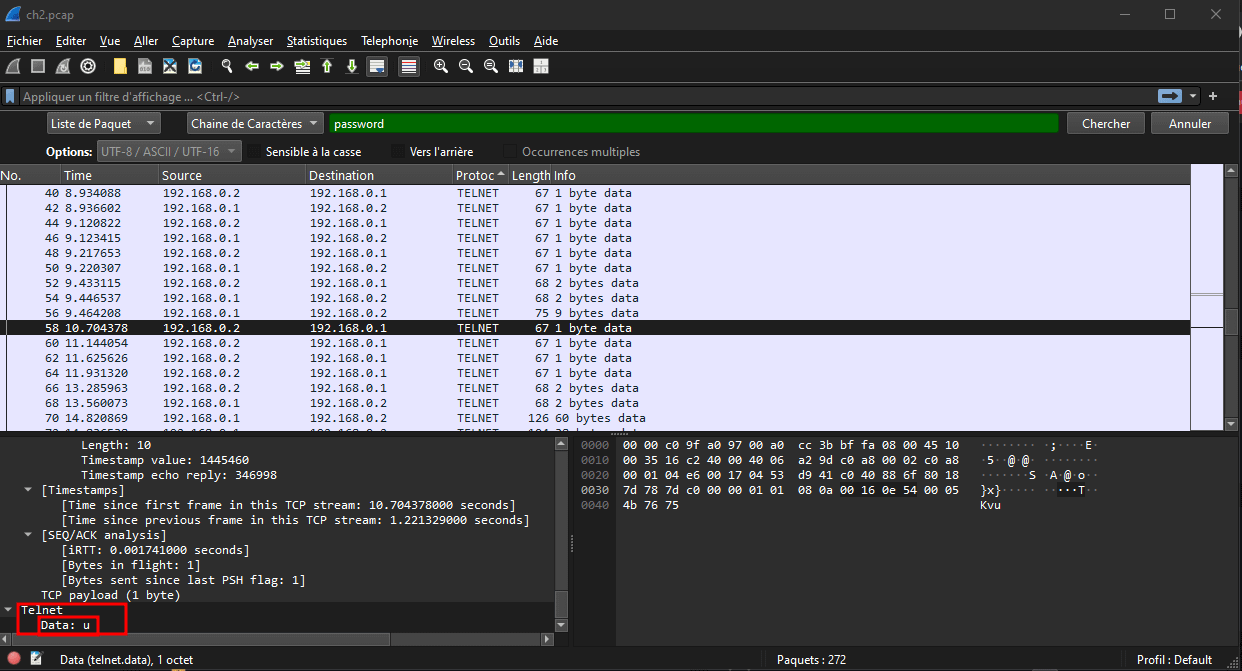 toutes les valeurs des trames telnet suivantes jusqu’à obtenir une suite de caractères Dans notre cas, le mot de passe en clair est fragmenté en plusieurs lettres :