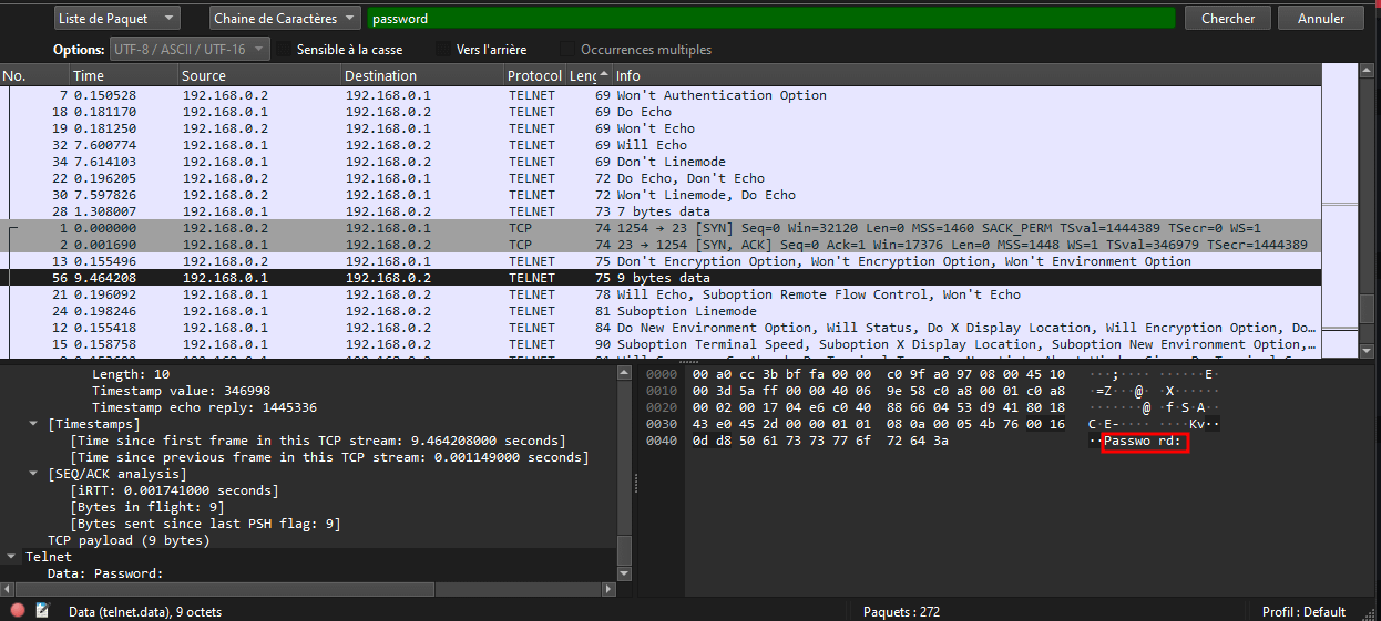 Il faut prioriser les trames avec une plus grande longueur car cela signifie qu’il y a une quantité plus importantes de données et potentiellement des interactions plus nombreuses entre l’utilisateur et les serveurs ainsi il nous reste plus qu’à filtrer les trames utilisant le protocole telnet(car tout le contenu sera en clair) et ensuite retrouver une trame qui retourne dans Telnet>data: Password et ensuite il faudra regarder toujours dans data: