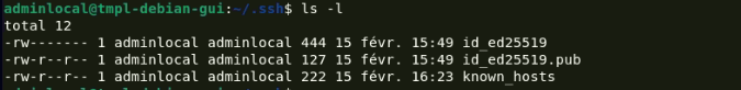 Le fichier id_ed25519 est configuré pour être lisible et modifiable uniquement par son propriétaire, ce qui en fait un élément confidentiel. En revanche, le fichier id_ed25519.pub peut être partagé librement, car ses permissions sont adaptées à cette utilisation.