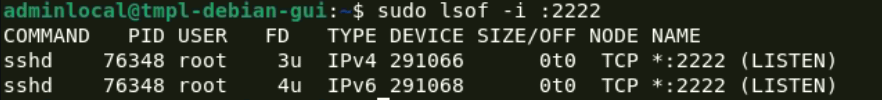 Vous pouvez aussi utiliser la commande lsof (List Open Files) pour lister les fichiers ouverts par les processus et identifier celui qui utilise le port 2222 et voyez si c’est bien sshd qui est en écoute dessus.
