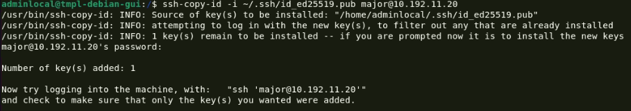 Il vous demandera de rentrer le mot de passe utilisateur pour lequel vous avez choisi de copier la clé publique, une fois le mot de passe utilisateur saisi, il vous indiquera qu’une clé à été ajoutée sur la machine distante et qu’il ne vous reste plus qu’a vous connecter avec la commande de base en SSH pour tester la liaison.