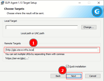 Renseignez le nom de domaine ou l’adresse IP de votre serveur GLPI dans « Remote Target ». Puis cliquez sur « Next ».