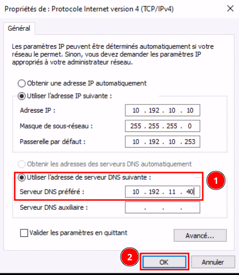 Pensez à modifier le « Serveur DNS Préféré » sur votre interface réseau par l’adresse IP de votre Active Directory sur votre PC client pour que le Serveur DNS puisse résoudre les requetes DNS de votre Client.