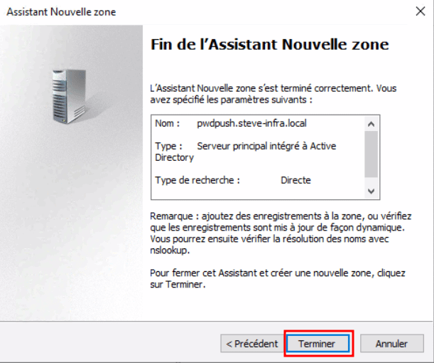 Vous arriverz à la fin de l’assistant de nouvelle zone avec un résumé des paramètres que vous allez appliquer et faites « Terminer ».