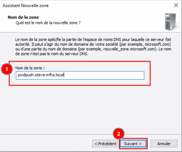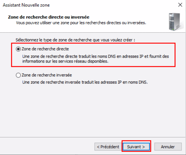 Après, il vous faudra choisir entre zone de recherche directe ou zone de recherche inversée, dans notre cas nous avons besoins que le nom de domaine de notre Password Pusher soit résolu en adresse ip par notre serveur DNS Active Directory.