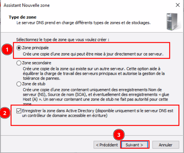 Suivez l’assistant pour créer une nouvelle zone. Vous serez invité à choisir entre une zone principale, secondaire ou stub. Pour un sous-domaine, choisissez « zone principale », puis vérifier que la case pour « Enregistrer la zone dans Active Directory » soit bien cochée et faites « Suivant ».
