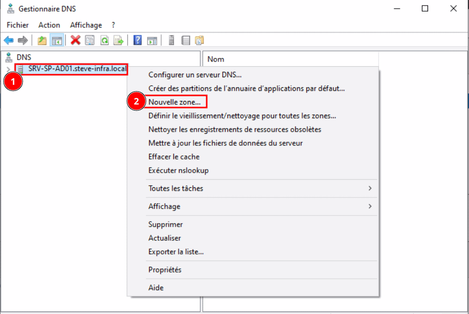 Dans le Gestionnaire DNS, développez votre serveur DNS et trouvez le domaine sous lequel vous souhaitez créer le sous-domaine. Faites un clic droit sur le domaine parent et sélectionnez « Nouvelle Zone ».